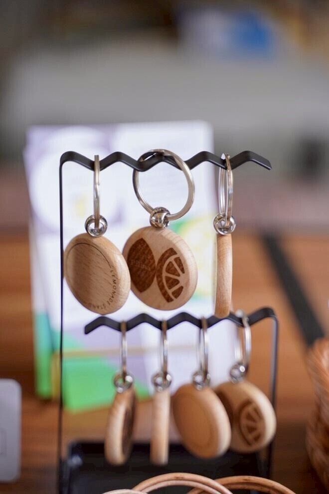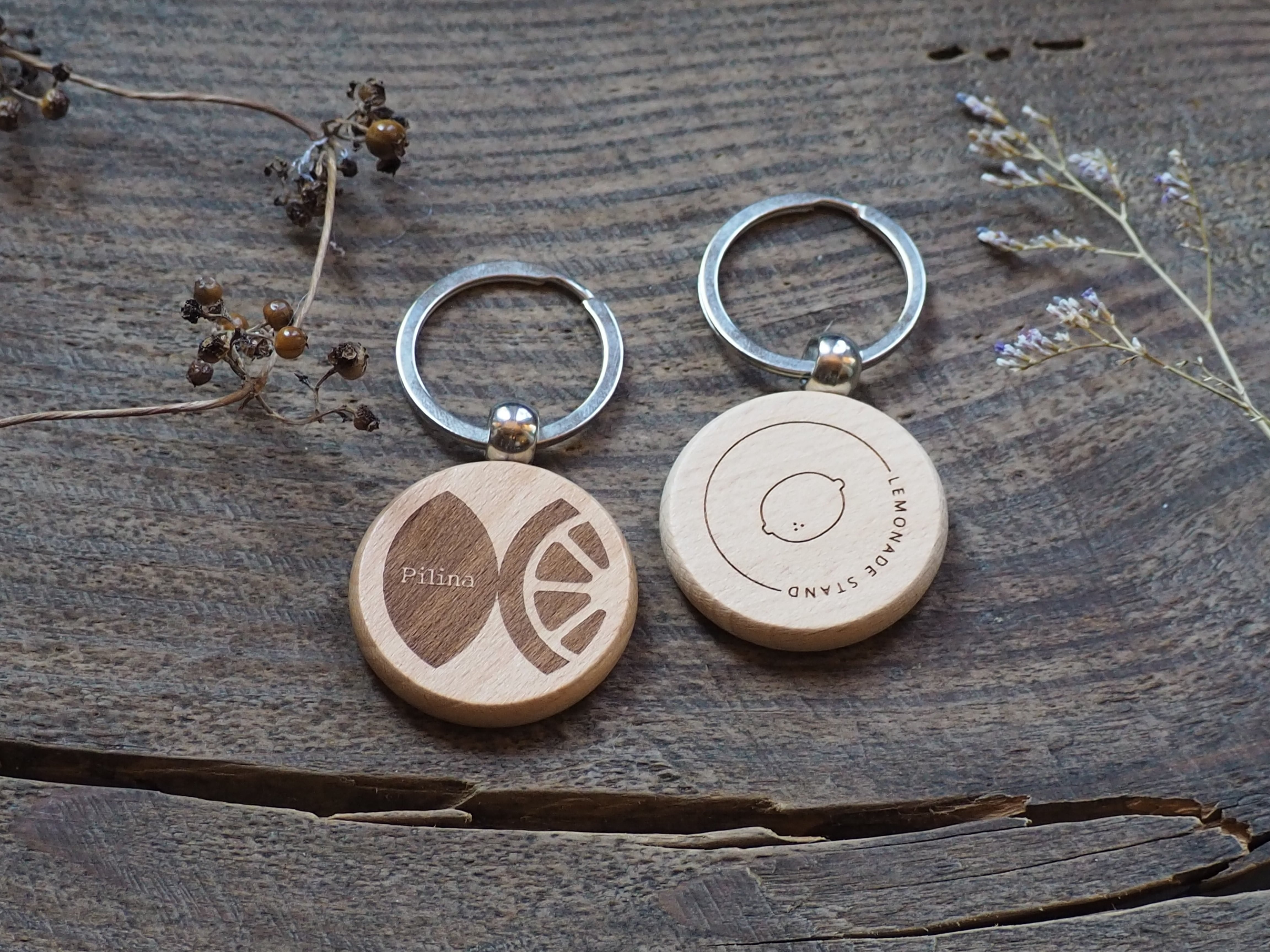 表面にはPilinaのロゴ、裏面にはかわいくシンプルなレモンをあしらった、丸形の木製キーホルダーです。
